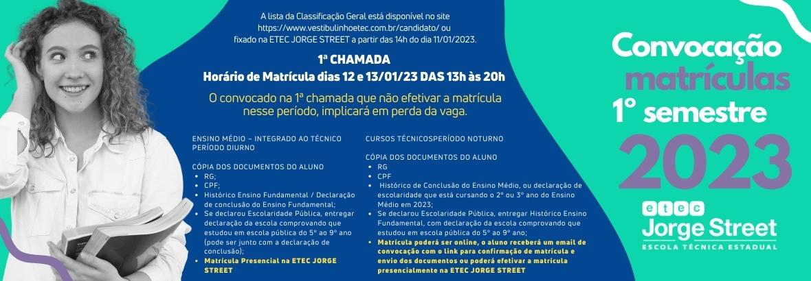 A lista da Classificação Geral está disponível no site https://www.vestibulinhoetec.com.br/candidato/ ou fixado na ETEC JORGE STREET a partir das 14h do dia 11/01/2023.