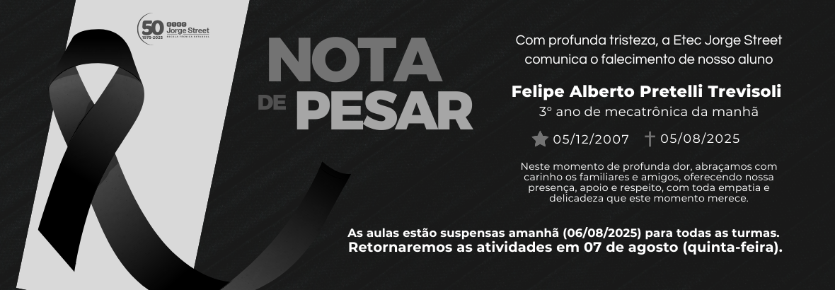 NOTA DE FALECIMENTO   É com profundo pesar que a Etec Jorge Street comunica o falecimento de nosso aluno Felipe Alberto Pretelli Trevisoli do 3° ano de mecatrônica da manhã, ocorrido hoje à noite.   Neste momento de dor, expressamos nossa solidariedade e condolências aos familiares e amigos, nos colocando integralmente à disposição para prestar todo o apoio necessário, prezando sempre pelo respeito, pela empatia e pela privacidade dos familiares.   As aulas estão suspensas amanhã (06/08/2025). Retornaremos as atividades em 07 de agosto (quinta-feira).