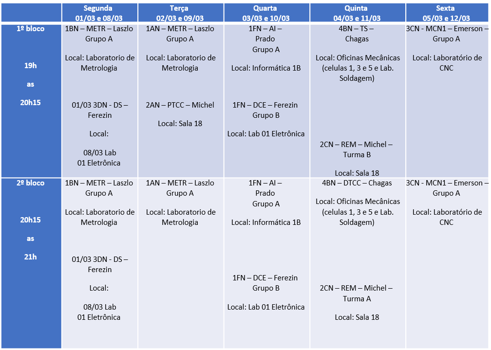 HORÁRIOS DAS AULAS