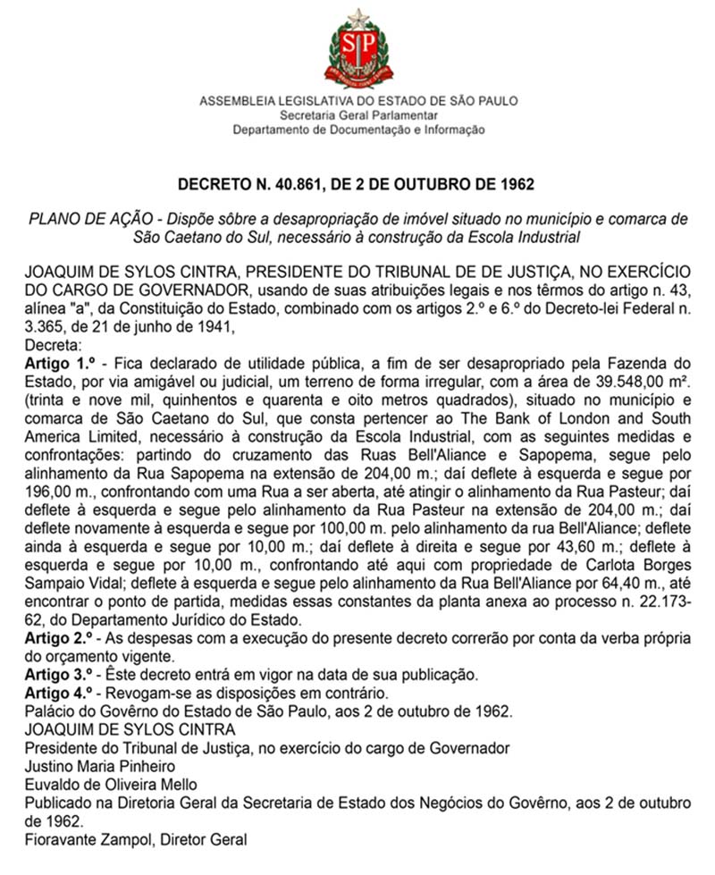 O terreno onde está construída a Escola pertencia ao Bank Of London And South America Limeted e foi desapropriado pelo decreto nº 40.861 de 2 de outubro de 1962.