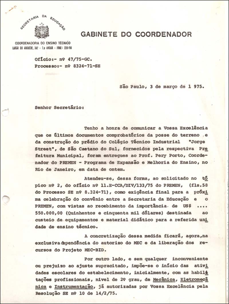 Cópia do ofício nº47/75-GC sobre o Processo nº 8324/71-SE que trata sobre o convênio:
