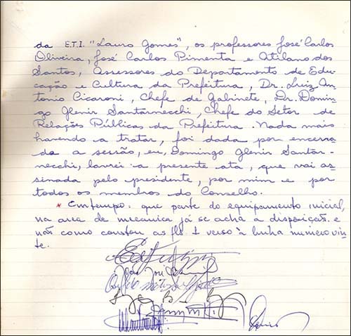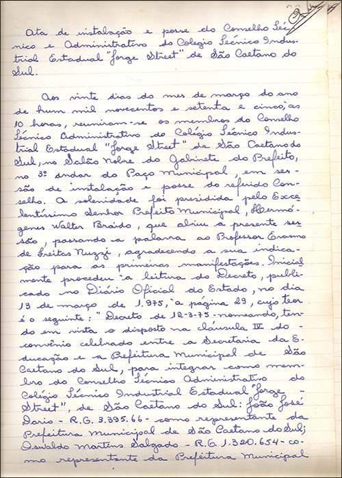 Segue abaixo páginas da ATA original de instalação do Conselho Técnico e Administrativo do “Colégio Técnico Industrial Jorge Street” de São Caetano do Sul.
