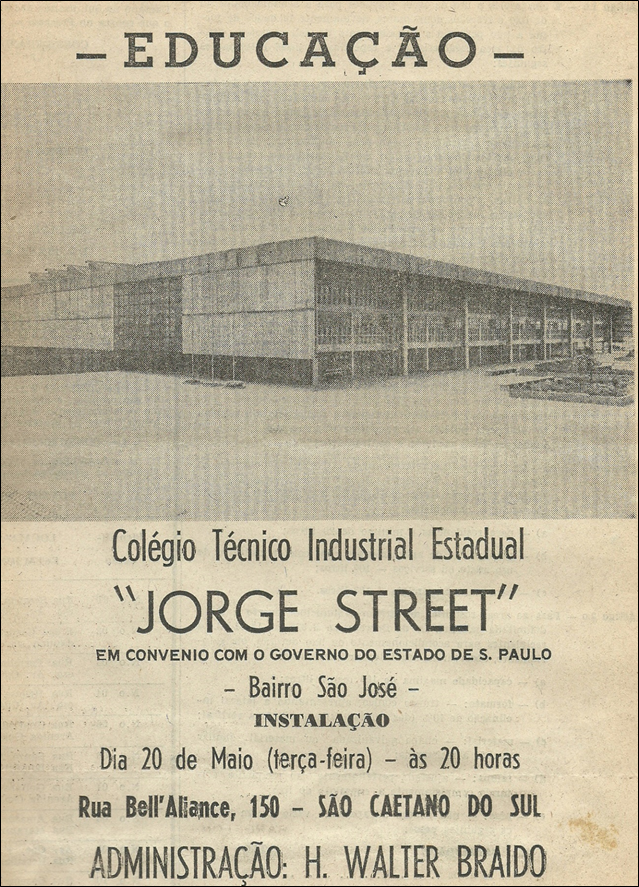 Durante a cerimônia inaugural, o Prefeito Walter Braido, depois de ressaltar a importância do novo estabelecimento de ensino que visa a profissionalização em nível de 2º grau para jovens da cidade, teceu considerações sobre o sue programa educacional, cujas bases foram lançadas ainda no seu primeiro mandato. Falando a respeito da Escola que estava sendo instalada, o Prefeito lembrou da construção há cerca de 6 anos e que permaneceu paralisada por longo tempo, até que, em razões de gestões mantidas por seu governo adquirisse condições para atender a demanda da cidade e das industrias da região por mão de obra especializada. Ainda falaram o Dr. Paulo Pires da Costa, representando o Dr. Roberto Cerqueira Cesar, secretário de Assuntos Metropolitanos, do Governo do estado de São Paulo, mencionou os convênios firmado e que alcançaram a cifra de 550 mil dólares ao funcionamento da Escola. O Prefeito ainda manifestou sua satisfação em poder contar com o apoio das autoridades educacionais do Estado e da união, o que proporcionou os meios necessários e adequados para o funcionamento do Colégio Técnico industrial Jorge Street, cujas atividades seriam iniciadas no dia seguinte com 200 alunos já matriculados nos cursos de mecânica, eletromecânica e instrumentação.
